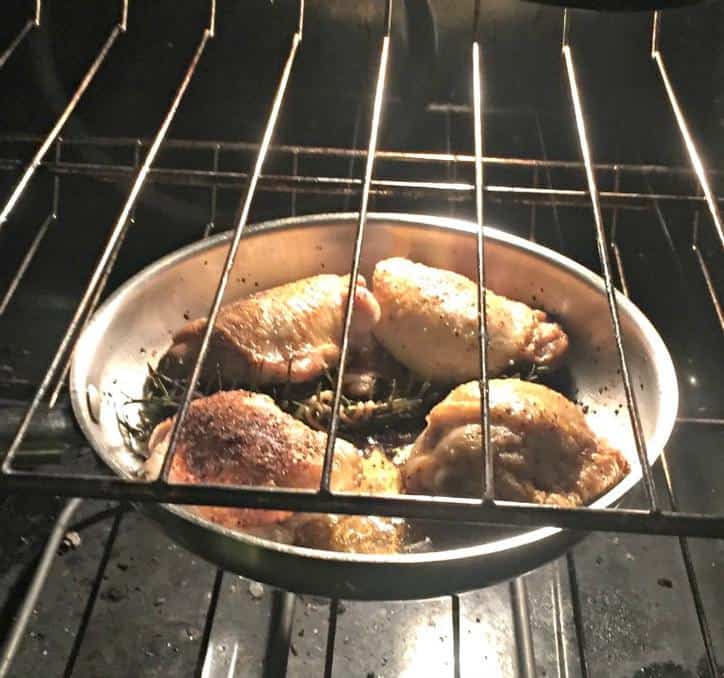- Preheat oven to 385. Peel and smash the garlic cloves. Tie the Rosemary together with kitchen string. Heat 2 tbs of vegetable oil in an oven proof pan. Salt and pepper the chicken on both sides while waiting for the oil to heat. When the oil is hot and the surface of the oil is rippled, place the smashed garlic cloves in the oil and cook for 1 minute. Then place the chicken skin side down in the hot oil and allow to brown for several minutes. Turn the chicken and allow to brown on the other side as well (about 3 mins per side). Add the Rosemary bunch and the bay leaf to the pan and place the pan in the preheated oven and allow the chicken to cook for about 30 minutes until cooked through and juices run clear.