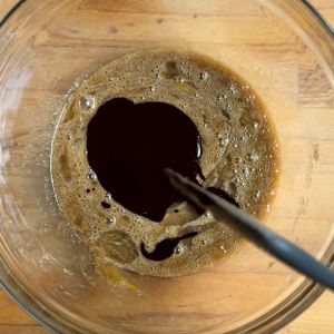 Add Wet Ingredients- Next, we add corn syrup, melted butter and cocoa mixture, vanilla, and the bourbon.