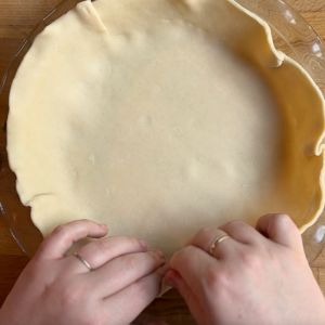 - Put the pie crust in a pie plate and crimp the edges with your fingers.