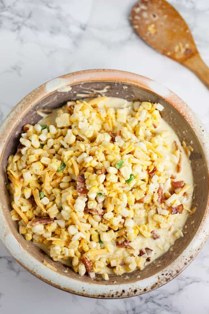 - Add the melted butter, sugar, onion, salt, pepper, mustard, ½ Cup cheese, corn, green chilis and ½ of the crumbled bacon.